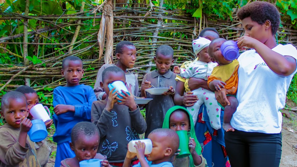 After boiling porridge, all children attended the FARN session are being fed. They are enjoying porridge with appetite. This was facilitated by OSKDA members